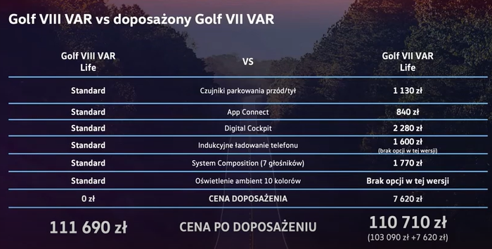 Golf VIII Variant w stosunku do poprzedniej generacji modelu jest droższy w przypadku wersji 1.6/2.0 TDI 115 KM o średnio 10000 zł w wersji Golf, 8500 zł w wersji Life oraz 15000 zł w wersji Style. Skąd różnica w cenie? Wpływ na cenę modelu ma przede wszystkim doposażenie poprzednich wersji wyposażenia o dodatkowe systemy, które kiedyś były opcją, aktualnie weszły do standardu. przykładem dla wersji life jest System radiowy “Composition” czy Oświetlenie ambientowe 10 kolorów, gniazda USB C z przodu i z tyłu, czujniki parkowania przód/tył. Różnica w cenie bogato wyposażonego Golfa VII a nowego Golfa VIII z systemami w pakiecie standardowym wynosi niecałe 980 zł.